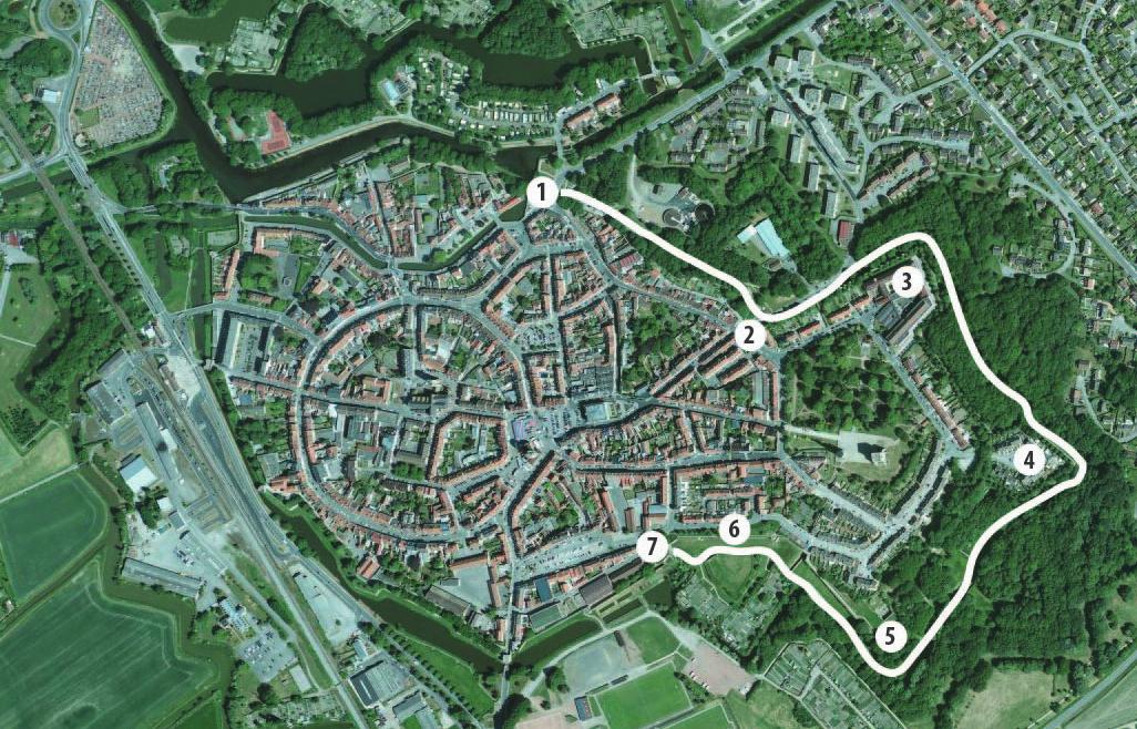 1. Porte d’Hondschoote 2. Porte Bâtarde 3. Bastion Saint Winoc 4. Bastion Royal 5. Bastion Saint-Pierre 6. De drie ronde torens van de Rempart Bourguignon 7. Tour des Faux Monnayeurs