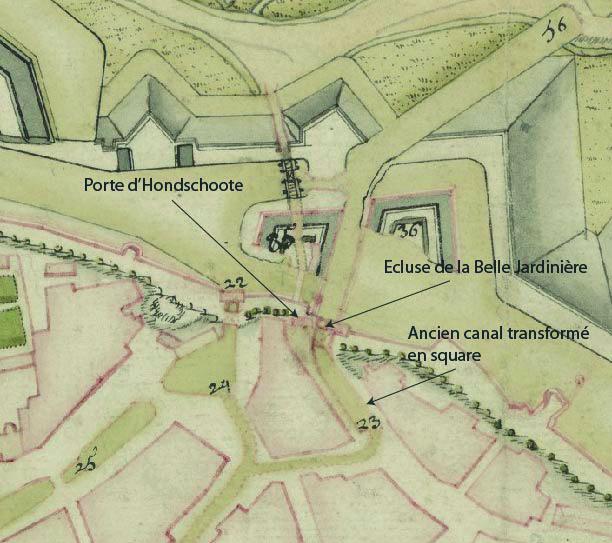 Part of a map of Bergues dating from 1734 showing the pworte d’Hondschoote (gate) and la Belle Jardi-nière
