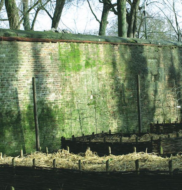 Het bezoek vond in het voorjaar plaats, waardoor heel wat plantenbedden nog niet aangeplant waren. Langs de muren staan leifruit en klimrozen (Rosa ‘Dentelle de Bruges’).