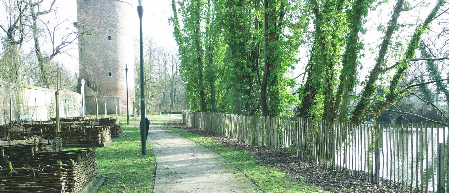 Voor de veiligheid van de wandelaars werd langs de oever een omheining van gekloofde staken van kastanjehout geplaatst.
