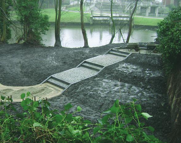 De oude greskeien worden opnieuw gebruikt. Enkele stukken werden echter volledig met kleiklinkers ver-nieuwd.