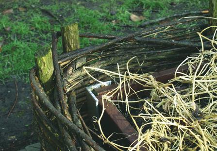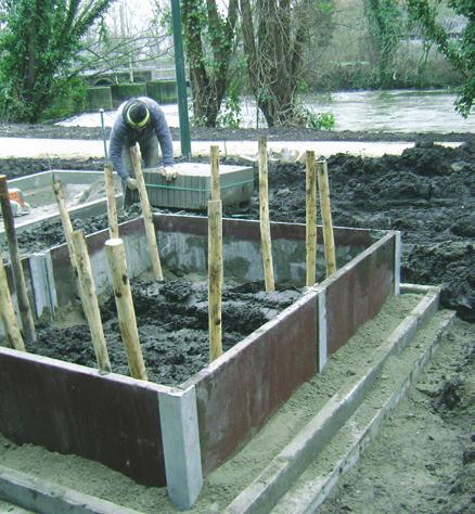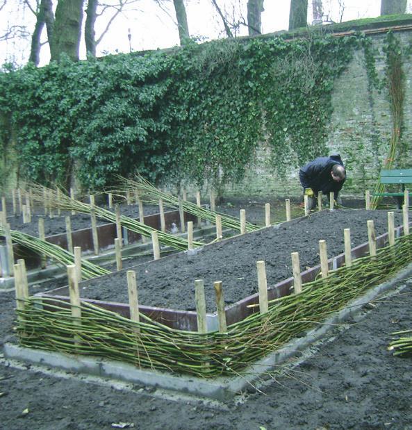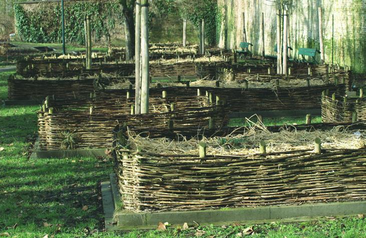 With the ground being waterlogged, the decision was taken to build planters offe-ring a more welcoming environment for vegetables, flowers and other plants. These planters are not situated above ground-level. The sides of the planters are built from concrete slabs and covered in woven natural branches, the additional soil is in contact with the existing natural ground.