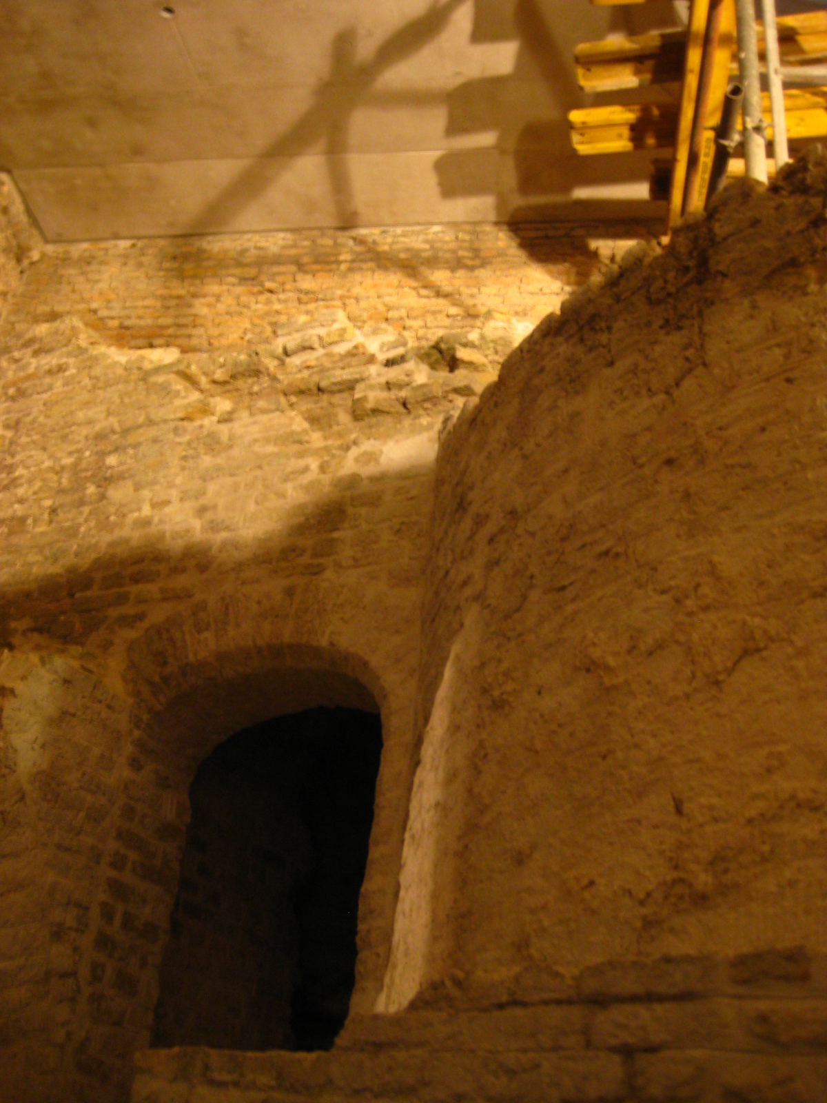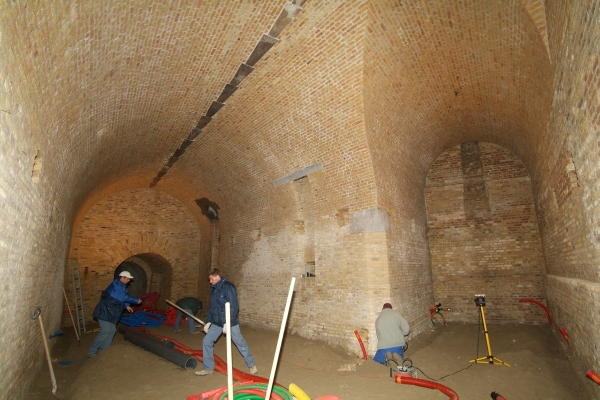 Lors de travaux de restauration de la salle souterraine, des vestiges de structures anciennes (XV-XVIIe siècle) ont été mis à jour : deux tourelles en brique reliées à un plan de maçonnerie, percé d’une ouverture à plus d’un mètre du sol permettant l’accès à un escalier hélicoïdal, situé dans la tour ouest. Cette découverte est importante et la Ville de Gravelines souhaite que ces vestiges soient à l’avenir accessibles au public, au même titre que la salle souterraine récemment restaurée qui sera le futur centre d’interprétation de la ville forte. Cette restauration et consolidation se fera dans un souci de parfaite lisibilité archéologique. Une salle souterraine sera aménagée sous le futur remblai, traitée de façon résolument contemporaine, accessible par la poterne existante, dont la voûte sera reconstituée jusqu’à l’accès de la salle. Elle sera élevée en béton armé brut de décoffrage. La voûte de la poterne ne sera pas reconstruite afin d’offrir une vue sur les deux tourelles, celle de l’ouest sera accessible par un emmarchement métallique avec une reconstruction partielle de l’escalier hélicoïdal, dont la partie supérieure sera constituée d’éléments métalliques. Grâce à cet escalier, il sera possible d’accéder à la terrasse, qui relie les deux tourelles, dont le sol en brique sera restauré. La tourelle en meilleur état de conservation recevra un cylindre en béton armé et en verre, qui aura le même diamètre que cette dernière. Ce puits de lumière assurera un minimum d’éclairage naturel. La restauration des vestiges comprendra notamment un nettoyage de l’ensemble des maçonneries, ainsi qu’une consolidation par injection de coulis de chaux et la reprise ponctuelle des fissures. Une partie des voûtes de la poterne, enfouie sous du remblai, sera étanchée à base d’asphalte, de même que toute la zone du bastion située au-dessus de la salle souterraine. La structure en béton armé de la salle recevra également un complexe étanche, qui permettra de disposer une couche de terre végétale avec gazon à la surface. L’ensemble sera recouvert de remblai qui sera conforme au profil du système des fortifications de l’époque avec les glacis, ses remparts d’accès, ses terrasses, ses chemins et ses banquettes de tir. Il est également prévu de rendre accessible au public le couronnement du rempart dans cette zone, ainsi que sur la surface entière du demi-bastion. |